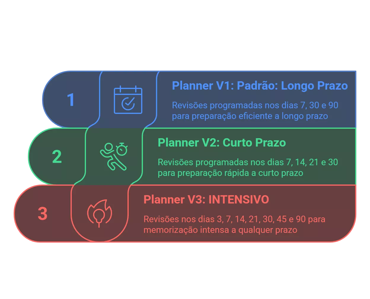 Ganhe 5 Modelos diferentes para você escolher, cada um com tempos diferentes entre as revisões, de acordo com o seu objetivo de estudo!