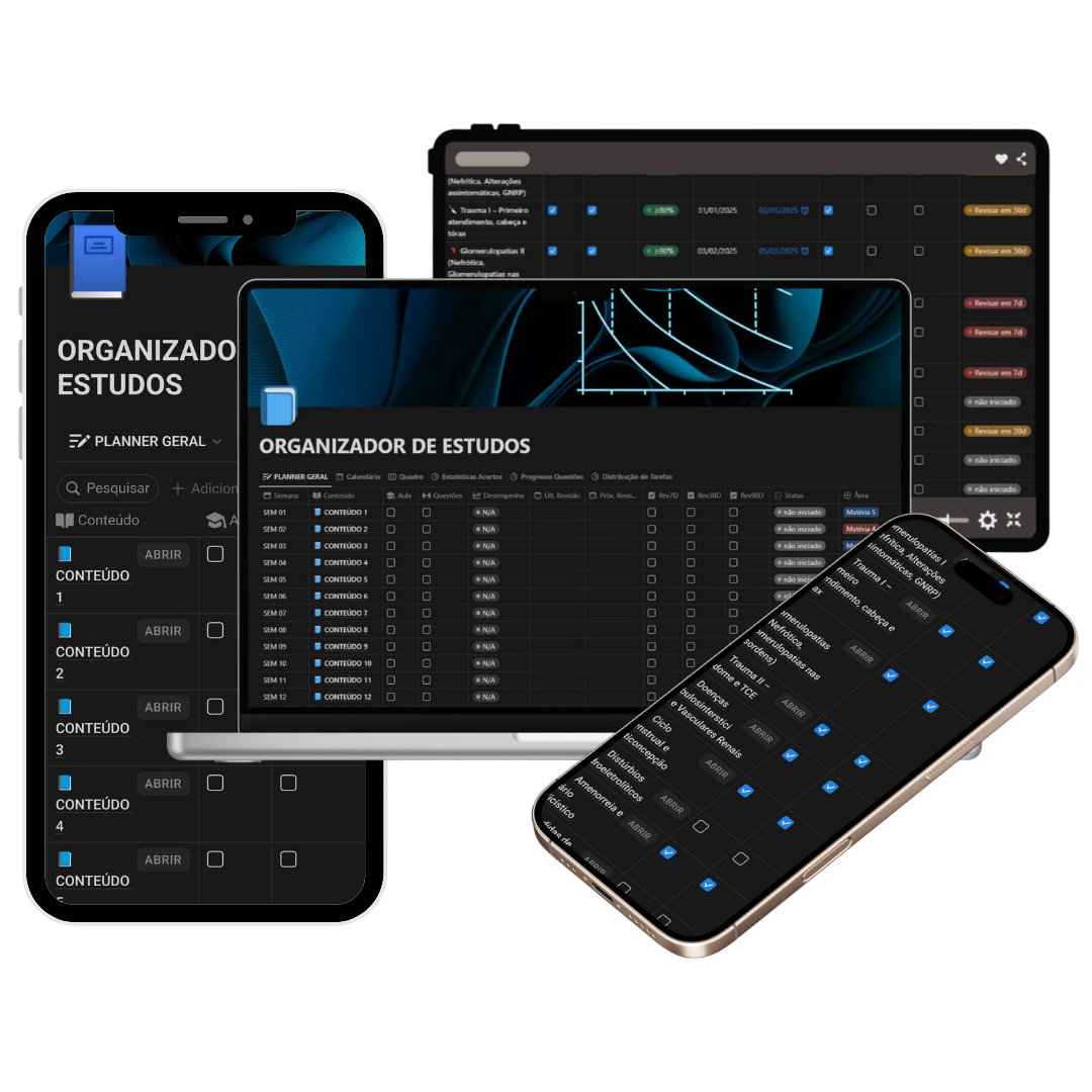 É um sistema digital feito no Notion que usa automações e inteligência artificial para organizar seus estudos de forma 100% personalizada. Ele ajuda a planejar revisões (calcula quando revisar e te envia lembretes para isso), priorizar conteúdos e acompanhar o progresso e desempenho nas questões, tudo em um só lugar.